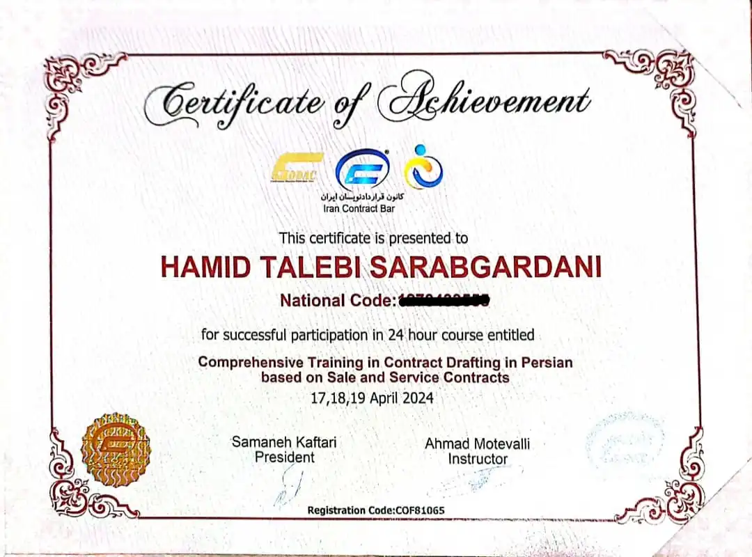 اینجانب حمید طالبی خود را به عنوان وکیل پایه یک دادگستری و کارشناس ارشد حقوق جزا و جرمشناسی معرفی میکنم. طی ۷ سال سابقه وکالت، همواره تلاش کردهام تا با تکیه بر دانش تخصصی و تجربه عملی، در مسیر احقاق حقوق موکلینم گام بردارم. به عنوان عضو رسمی کانون قراردادنویسان ایران، در زمینه نگارش و تنظیم انواع قراردادها نیز تبحر و تجربه کافی دارم. معتقدم که تنظیم دقیق و هوشمندانه قراردادها، نقش کلیدی در پیشگیری از اختلافات و تضمین منافع شما در آینده ایفا میکند. در این مسیر، شفافیت، صداقت و امانتداری را سرلوحه کار خود قرار دادهام. هدف من، صرفاً پیروزی در دعاوی نیست؛ بلکه ارائه راهکارهای حقوقی جامع و مؤثر است تا شما با آگاهی کامل، بهترین تصمیمات را برای مسائل حقوقی خود اتخاذ کنید. در تمام مراحل پرونده، از مشاوره اولیه تا پیگیریهای نهایی، در کنار شما خواهم بود. باور دارم که اعتماد شما، بزرگترین سرمایه من است. آمادهام تا با تعهد کامل، دانش حقوقی و تجربه چندین ساله خود، در کنار شما باشم و در پیچیدگیهای دنیای حقوقی، مسیر روشنی را پیش رویتان قرار دهم.