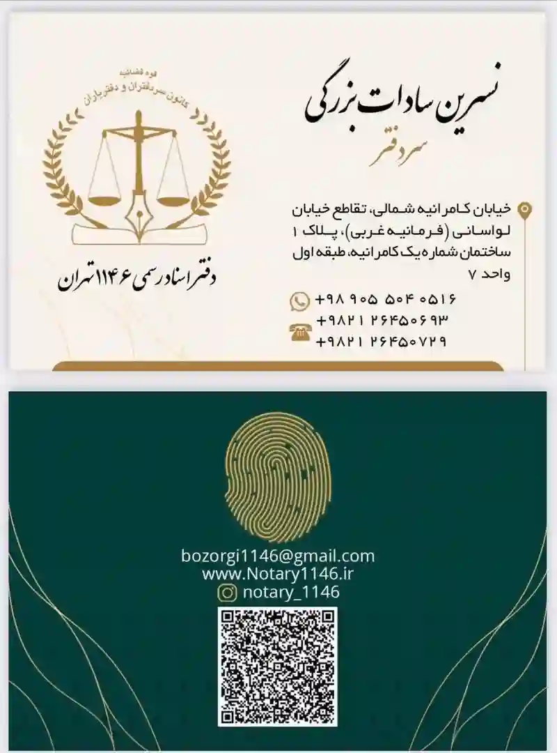 دفتر اسناد رسمی ، دفترخانه ، دفتر ثبت اسناد • دفتر اسناد رسمی ۱۱۴۶ • سردفتر : نسرین سادات بزرگی ثبت کلیه اسناد ‌قطعی ، رهنی ، صلح ، اجاره ، تقسیم نامه ، وکالت ،تعهد ، اقرار ، رضایت و گواهی امضا ، تک برگی و کپی برابر اصل ، ثبت وصیت نامه - وکالت امور خانواده - تاییدیه علائم تجاری و انتقال علائم تجاری دفتر ۱۱۴۶ تهران آماده همکاری با کلیه نهادها و شرکتهای دولتی و خصوصی و موسسات حقوقی و وکلای محترم و همچنین بانکها و آژانس های املاک و نمایندگی های فروش خودرو می باشد .