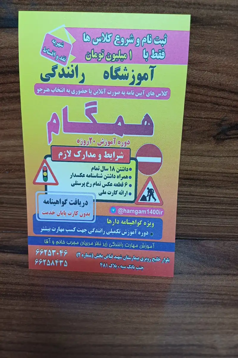 آموزشگاه رانندگی همگام بااستفاده از مدیران ومربیان دلسوز وباتجربه همگام با کلیه متقاضیان رانندگی و با هدف ترويج وارتقائ فرهنگ ترافیک ثبت نام کلیه متقاضیان گواهینامه و اتباع خارجی مجاز زیر نظر مدیریت وکادر مربیان مجرب و دسترسی آسان از طریق بزرگراههای فتح وآزادگان ب همگام