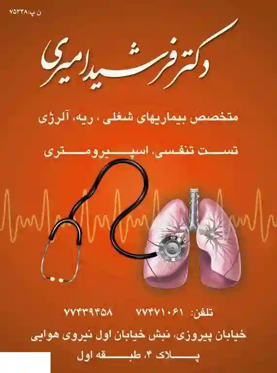 استان: تهران ، شهر: تهران ، منطقه 13 ، محله: پیروزی ، خیابان: نبش خیابان اول نیروی هوایی ، کوچه: دکتر فرشید امیری - متخصص ریه ، طبقه: 1 ، پلاک: 4