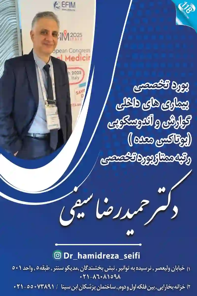 کد نظام پزشکی: 39824 بنده دکتر [نام] هستم و تخصص من بیماریهای داخلی، گوارش و اندوسکوپی است. من عضو انجمن گوارش و کبد ایران هستم و دارای بورد تخصصی داخلی از دانشگاه شهید بهشتی تهران میباشم.